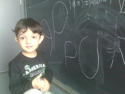 Appu writes on the walls of his room in Chennai. The chalkboard paint was a good idea - the only problem is convincing Rohan that it is only for chalk - and by the way, papa', how is it going erasing all the crayon marks?